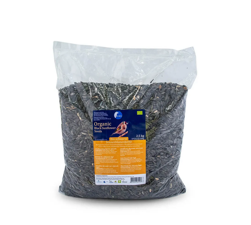 Zwarte zonnebloempitten hebben vergeleken met gestreepte zonnebloempitten een hoger oliegehalte. Daardoor krijgen vogels meer energie binnen. Deze zorgvuldig geselecteerde biologische zwarte zonnebloempitten zijn makkelijk te openen door kleine vogels. Wanneer u de zwarte zonnebloemzaden aanbiedt, zullen vrijwel alle vogels deze zelf pellen om de kern op te eten. Duiven eten wel de hele pit op. De meeste vogels eten alleen de kern en ze pellen hun zaadjes op de voederplek of nemen het zaadje mee en doen het elders. Wanneer ze het op de voederplek doen, blijven de schillen achter.